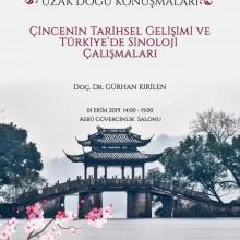 1 Ekim 2019 tarihinde, "ASBÜ-YDF Uzak Doğu Konuşmaları"nın ilkinde, Ankara Üniversitesi Dil ve Tarih Coğrafya Fakültesi (DTCF) Doğu Dilleri ve Edebiyatları Bölümü Sinoloji Anabilim Dalı Başkanı Doç. Dr. Gürhan KIRİLEN, "Çincenin Tarihsel Gelişimi ve Türkiye’de Sinoloji Çalışmaları" başlıklı bir konuşma yapmıştır. Konuşmasında, tarihsel süreçte Çin yazısının biçimsel değişimini gözlemleyebileceğimiz Jiaguwen, Jinwen, Xiaozhuan, Lishu, Kaishu gibi formlar üzerinde durmuş, Çin dilinin temel özelliklerini belirtmiştir. Bunun yanı sıra ülkemizde 1935 yılında kurulmuş olan Sinoloji kürsüsü ve çalışmaları hakkında bilgi vermiştir.